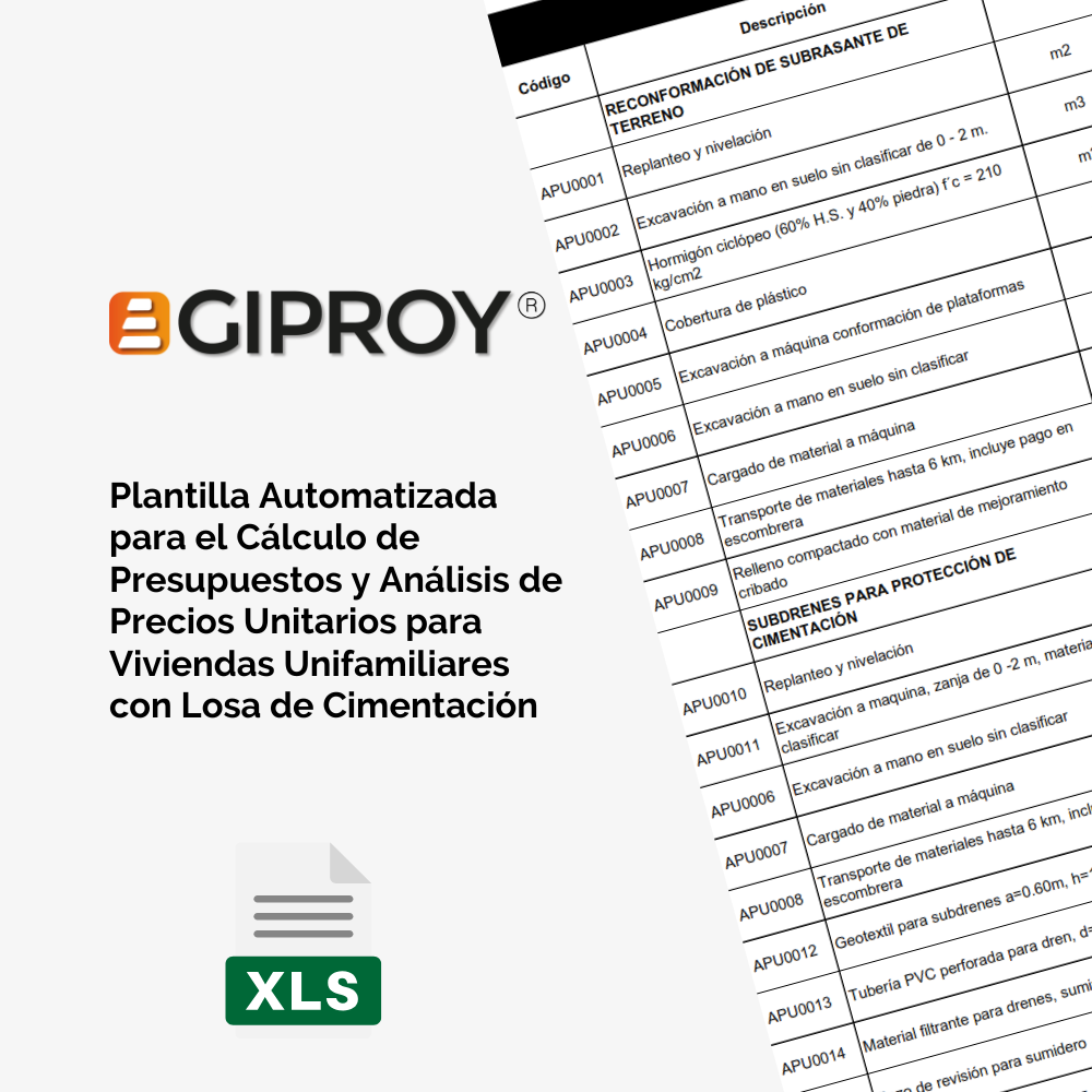 Plantilla Automatizada en MS Excel para Cálculo de Presupuestos y Análisis de Precios Unitarios para Viviendas Unifamiliares con Losa de Cimentación, muy usada en terrenos con baja capacidad de soporte, suelos blandos, altos niveles freáticos, entre otras condiciones. Esta plantilla es muy usada en el cálculo de costos para Viviendas de Interés Prioritario (VIP hasta USD 107.630) y Social (VIS hasta USD 83.660) en Ecuador.